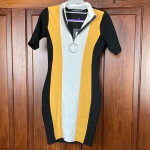 PrettyLittleThing NWT Yellow Black Motocross Striped Ring Pull Fitted Dress Sz 6