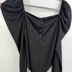 PrettyLittleThing New Black Ribbed Long Puff Sleeve Bodysuit US 8 Square Neck