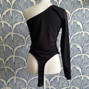 Sleek and minimalist one-shoulder bodysuit from PrettyLittleThing in classic black. Features a long sleeve on one side and high-cut thong bottom for a seamless silhouette. Soft, stretchy fit—perfect for nights out or elevated layering.