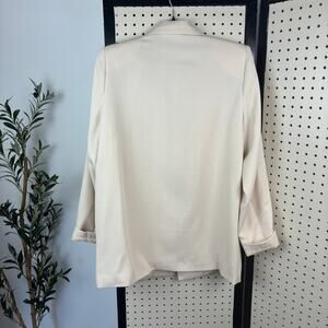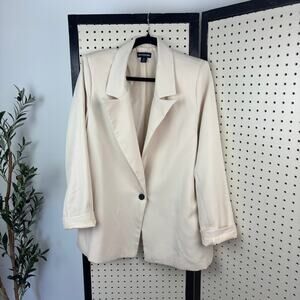 Chic oversized blazer in a neutral cream from PrettyLittleThing (Women’s 4)—clean, elongated lines for that minimalist / quiet-luxury look. Effortless office-to-weekend layer: throw over a tee and denim, style with trousers and loafers, or belt for shape. Has shoulder pads. Measurements are in the photos.