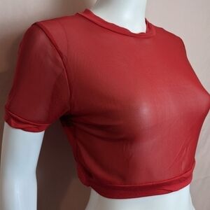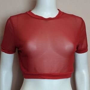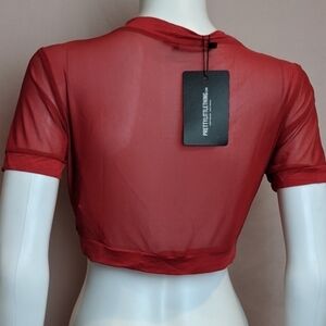 PrettyLittleThing Red Mesh Short Sleeve Sheer Crop Top size 10