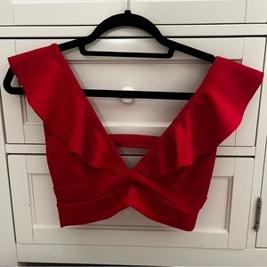 Stylish red crop top with ruffle details. V-neck design. Perfect for a chic look.