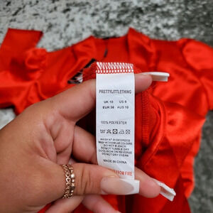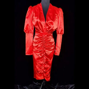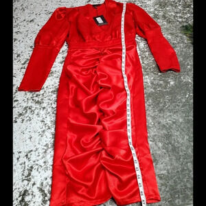 PrettyLittleThing Red Satin Ruched Skirt Puff Sleeve Midi Dress