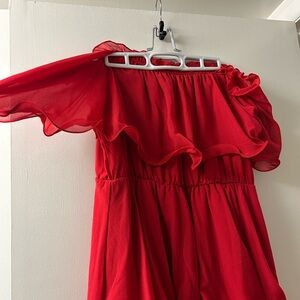 Elegant red ruffled off-shoulder dress. Perfect for special occasions. Worn once to a Christmas party. Looks good on basically any body type.