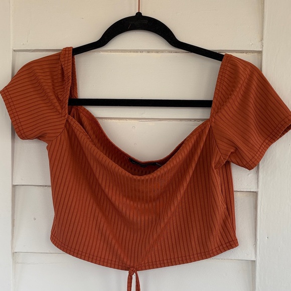 PrettyLittleThing Rust Ribbed Tie-Front Crop Top