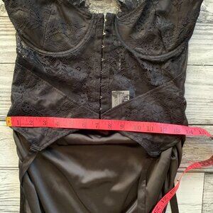 Pretty Little Thing Shape Black Sating Lace Overlay Corset Suspender Stretchy Bodycon Dress NWT.