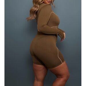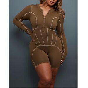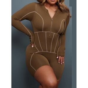 PrettyLittleThing Shape Contrast Stitch Zip Up Unitard Espresso Brown Size Large