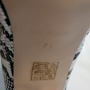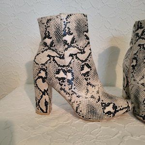 Chic snake print ankle boots by PrettyLittleThing. Features a stylish black and cream pattern. Perfect for elevating any outfit. I’m usually a 6.5-7, these just feel a little too big on me for my comfort. Excellent condition.
