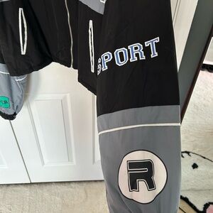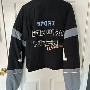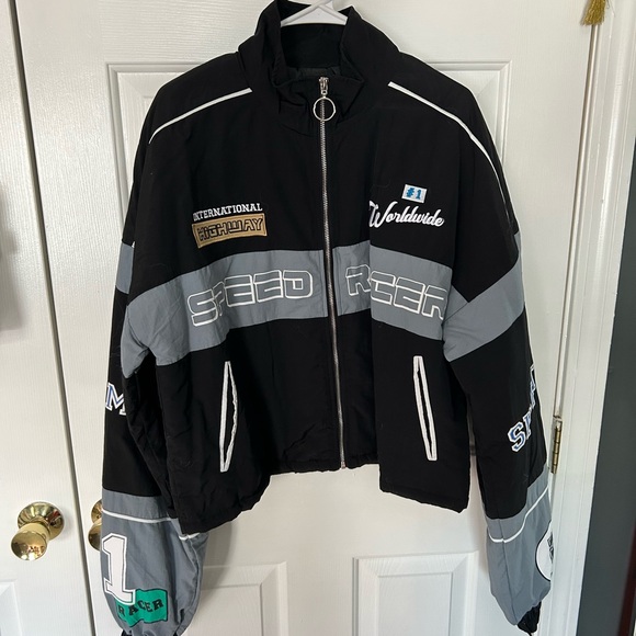 Stylish black and gray jacket with Speed Racer design. Features bold graphics and a zip-up front. Jacket itself is a thicker windbreaker material, keeps you warm. Never worn too big for me.