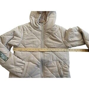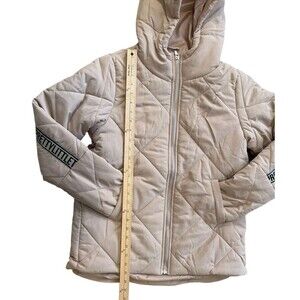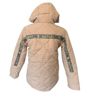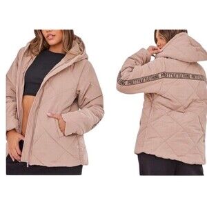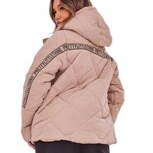 This PrettyLittleThing jacket is a quilted design in a stone beige color. It features a zip closure, long sleeves, and an oversized fit. The jacket is made of polyester with a microfiber fabric type and polyester lining. It has a hood, pockets, and a logo detail. Ideal for various occasions like travel, parties, work, or casual wear, it embodies a blend of USA, rock, punk, grunge, and other themes with a retro and hipster style.