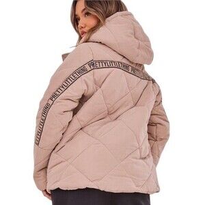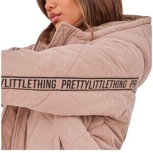 This PrettyLittleThing jacket is a quilted design in a stone beige color. It features a zip closure, long sleeves, and an oversized fit. The jacket is made of polyester with a microfiber fabric type and polyester lining. It has a hood, pockets, and a logo detail. Ideal for various occasions like travel, parties, work, or casual wear, it embodies a blend of USA, rock, punk, grunge, and other themes with a retro and hipster style.