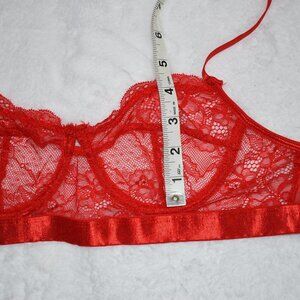 Pre-owned, great condition. No visible holes or stains. Vibrant fiery red all-over Lace. Adjustable elastic straps. Size per tag: L (Large). Fabric: 95% Polyester/ 5% Elastane. Size per tag does not guarantee desired fit. Please see pictures for measurements. Please note the bra length was taken with the straps adjusted to the max.