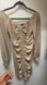 Elegant tan dress with long sleeves. Features ruched front detail. Perfect for stylish occasions.