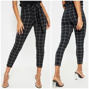 PrettyLittleThing Tweed Check Paperbag Pants. High Rise Black Plaid Paperbag Pants, Trouser Dress Pants. Slim Fit Ankle Crop Formal Pants, Super Flattering