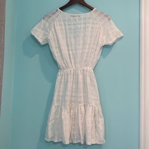 Pretty Little Thing, prettylittlething, PLT, new, dress, white, cover up, coverup, woven, woven material, pool attire, classy, sheer, cinched waist, horizontal stripes, sleeves, short sleeves, summer, summer dress, vacation, vacation dress, mini, mini dress, beach, beachy