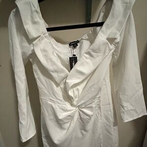Chic white dress with long sleeves. Features a stylish front twist. Perfect for elegant occasions.