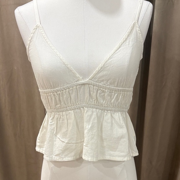 Chic white top with ruffle hem. Features a flattering V-neckline. Perfect for casual outings.