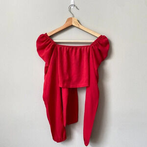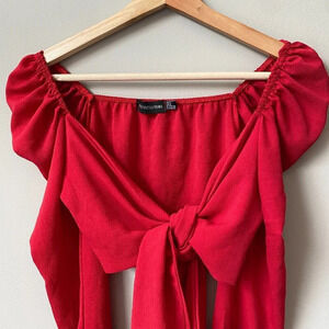 PrettyLittleThing Women's Size 2 Puff Long Sleeve Tie Bow Crop Top Blouse Red