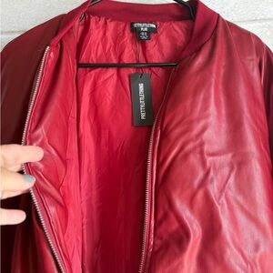 Striking red bomber jacket from PrettyLittleThingPlus Features a classic zip-up style. This is a faux, leather red bomber jacket cropped brand new women’s size 18 brand new with tags.