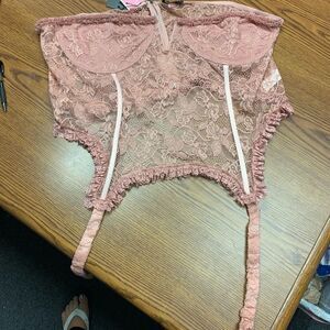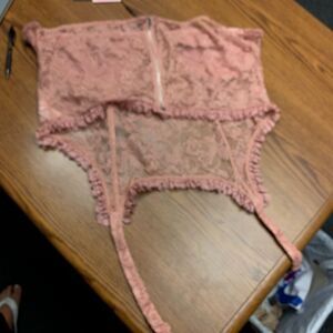 Brand news. Fits a size 26. Unstretched measures 24” across. Has a back zipper, strapless with faux front garters.