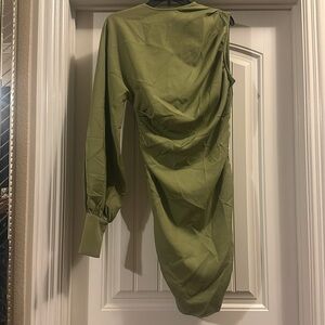 SAGE GREEN ONE SLEEVE RUCHED WOVEN BODYCON DRESS.