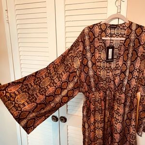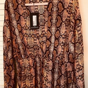 Snake skin patterned chiffon/ polyester mix Romper with overlap V neck front,flare long sleeve and an elasticated waist with a tiny draw string.Size is Medium.New with tag