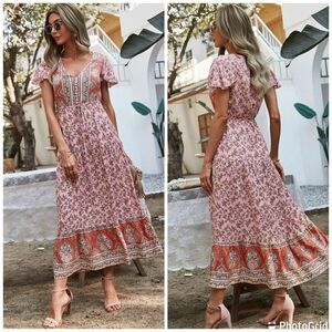 Prettygarden Boho Multicolor Printed V Neck Bohemian Maxed Dress