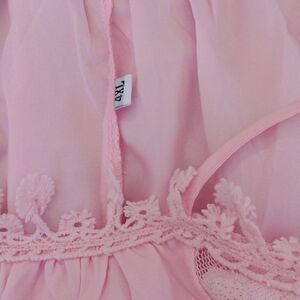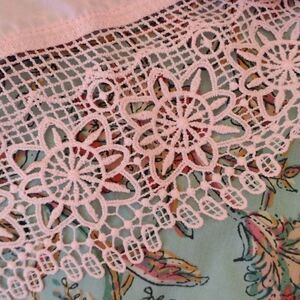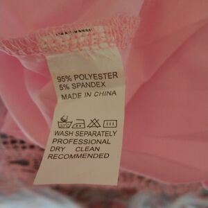 Such a pretty cold shoulder dress for warmer weather. At the top a fun trim. The sleeves are sheer and trimmed in lace. Straps at the shoulders. Layers of gathered fabric with lace between. Fully lined to the bottom where YOU show through. Shift shape. Size 4X measures 48 at chest, 48 at waist, 80 at bottom hem. 36 long from shoulder to hem. This is a warm pink, the last picture is best for color. So pretty and cool for now.