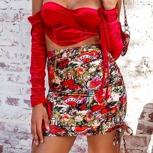 Prettylittlething Tattoo Print Mini Skirt. This ruched side mini skirt is sure to give your look a bold edge. Featuring a tattoo print satin material with a ruched side and a high waistline, team it with a red velvet crop top and heels for a bold weekend combo. Adjustable ruched side to the length you want!