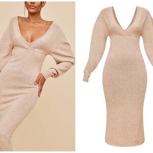 Prettylittlething Oatmeal Cold Shoulder Knit Lace Sweater Dress M