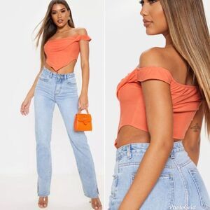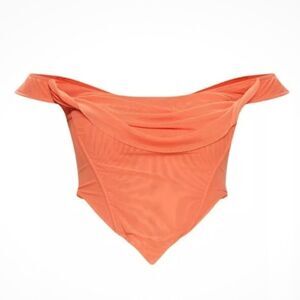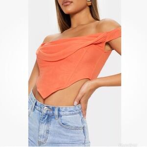 Prettylittlething Orange Pink Peach Corset Off The Shoulder Mesh Bardot Crop Top