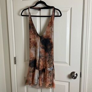 Stylish halter mini dress with a tie-dye pattern. Features a blend of brown and cream colors.