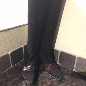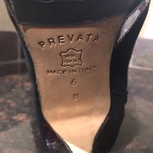 Prevata Brand black suede and leather boots. They have a side zipper and there is some tip wear and some water damage to the boots which I tried to get the best picture of the damage. That is why they are priced so low but I still think they are very wearable and can still be given lots of love since damage is only noticeable when you are very close up. These boots are very comfortable and are buttery soft. For Italian leather and suede at this price, it's a great offer that can't be beat.