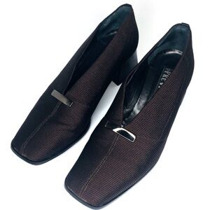 Authentic Prevata Italian loafers, crafted with refined Italian design. These rich brown shoes feature a textured fabric upper, structured square toe, and a sleek silver-tone accent across the vamp. The coordinating brown block heel adds comfort and polish, making them a perfect match for tailored pants, wide-leg slacks, or longer skirts that highlight their structured elegance.
