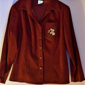 Previously Owned Excellent Condition R&K Women's Velvet Like Blazer. This is in excellent condition and is a wonderful buy.. The Material feels like it is velvet and the embroidered flowers is elegant in nature. The size is a 14W 97% Polyester and 3% Spandex. Arm length is 16" The upper arm around is 18 inches around. With buttons closed the Bust is 40" around and the stomach is 40 Inches around. The embroidered flower is yellow and on pocket.