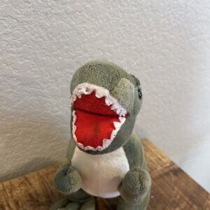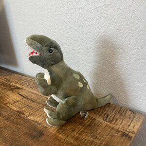 This Prextex plush dinosaur T-Rex is a retired stuffed animal that stands at 9 inches tall. The realistic toy is made of soft green plush material and is perfect for any occasion, particularly retirement. The T-Rex is a popular choice for dinosaur enthusiasts and would make a great addition to any collection. Handmade with care, it features intricate details that bring the ancient creature to life. The dinosaur species is specifically identified as a Tyrannosaurus Rex. The stuffed animal is suitable for children and adults alike and is sure to be a beloved companion.