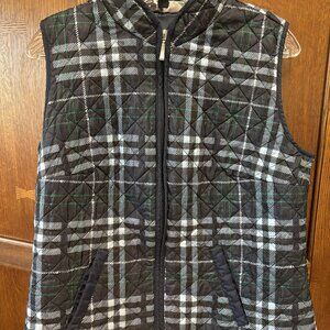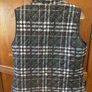 Very nice womens quilted vest by Karen Scott. It's pre-owned but in great condition. It's plaid, black, white and light blue. It has a zipper front and a pocket on each side.