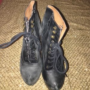 Gently used. One of Jeffrey Campbell's most popular styles. These boots are extremely sexy. Laced up the front. Stitching up the back. Zips on the inside. 6 1/2 inch heel/wedge. They are a matte distressed leather look. There are scuffs to them, however it gives the boot more of a rugged biker feel. I love these boots but every time I wear them I fall!! Lol😂 so I'm going to pass them onto a girl who can handle the height!