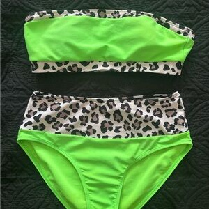 Vibrant neon green bikini with leopard print accents. Strapless top and high-waisted bottoms. Bold and stylish design.
