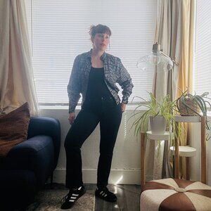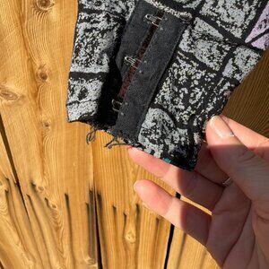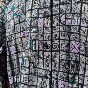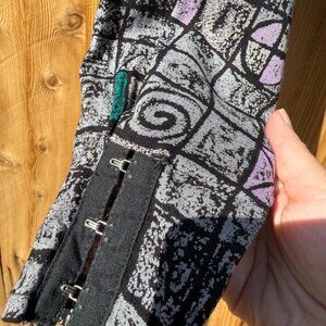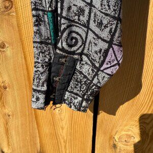 Details- This is a vintage 1980s to 1990s era button down jacket blouse in a primarily grey and black colorway with pops of purple and green. Lightweight with an elasticized bottom. Sleeve cuffs have hook and eyes. Honestly this feels a bit like it might have been part of a dance costume but the material isn’t typical of that.