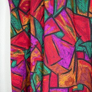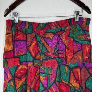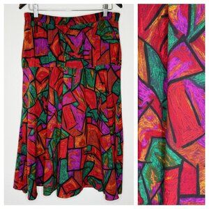 Details- This is a vintage 1990s era abstract printed skirt in a red, green and purple colorway. Elastic waist with a dropped waist.