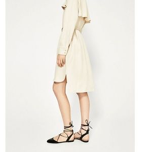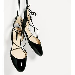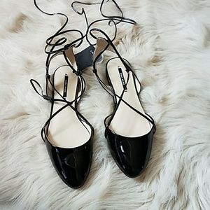 Flat black sling-back shoes. Tie-up straps. Patent finishing effect. Bow fastening at ankle. Brand new with tags. Box included.