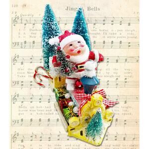 Add nostalgic holiday charm to your décor with this whimsical Christmas assemblage featuring Santa Claus riding a vintage-style toy train. Santa is joyfully perched atop a glitter-dusted yellow train engine, surrounded by colorful gift packages, candy canes, and snowy bottle brush trees. Accented with a red gingham bow and vintage-inspired details, this one-of-a-kind piece captures the magic of Christmas past.