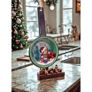 Add a touch of nostalgic holiday charm to your décor with this one-of-a-kind Christmas diorama assemblage. Crafted inside a vintage green enamel pot, this whimsical winter scene features an adorable teddy bear dressed in a Santa outfit, seated among miniature bottle brush trees, red Christmas ornaments, and sparkling snow.