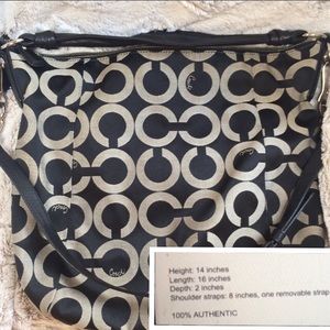 Coach signature OP Art Kristin large shoulder Convertible Hobo bag purse 14761 Black White 💯Authentic .This was actually a gift 🎁 ( more like hammy down) from my older sister who is Totally into luxury goods So it does have a place in my heart but haven't worn in 3+ years so I just want some one who will use & love it . Like title said convertible with both straps. Only flaw is inside dirty from makeup and such but probably easy clean and the coach box I'm sending in is a little beat up