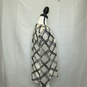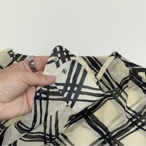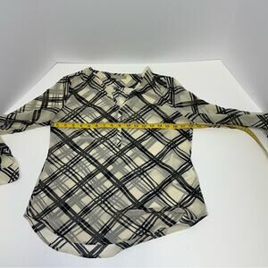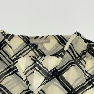 Elevate your wardrobe with this chic Banana Republic sheer plaid button-up blouse, perfect for layering or wearing on its own. This blouse features a classic black and cream plaid pattern, adding a timeless yet modern touch to any outfit. The snap button closure is concealed for a seamless look, and the blouse’s sheer fabric gives it a light and airy feel, making it ideal for both casual and dressy occasions.