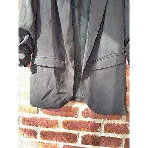 Priceless “Good Feeling” blazer in black. Collared neckline with a notched lapel. One button front closure, two side welt pockets and subtle shoulder pads for structure. The sleeves are approximately 3/4 length with a scrunched sleeve. Size small. The pit to pit is 19” and the length is approximately 26.5”.