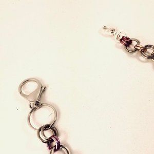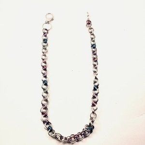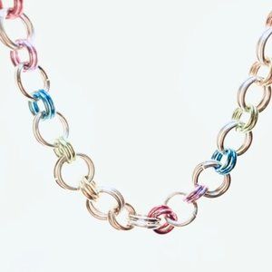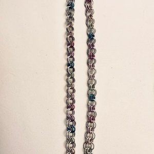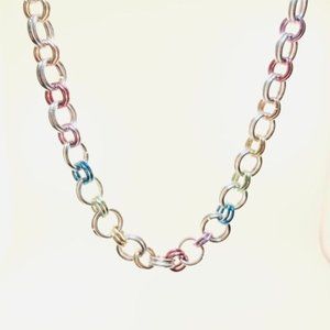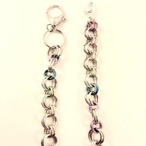 BELT CHAIN WITH Key Ring: Handcrafted in street style, our Pride belt chain has two round heavy duty clips, a matching chrome finish key ring, and is gender free. Hand constructed steel rings are woven in a rainbow chainmaille pattern to create this oversized chain for an eye-catching Pride Piece. Lead and nickel free. Catch this piece today!
