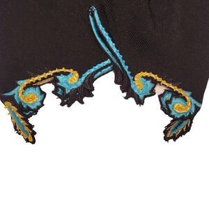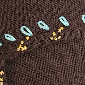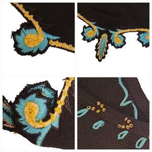 Beautiful Prima Bella Sweater in excellent pre-owned condition with no stains, flaws, or signs of wear. Turquoise and gold embroidery and tiny beads. See photos for measurements, fabric content, and care. Size medium