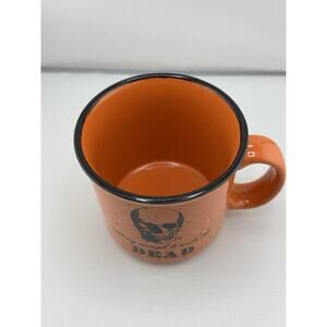 The Prima Design Skull Mug is a large, round ceramic coffee mug with a contemporary design featuring an embossed skull pattern. It has "Strong Enough to Wake the Dead" on the sides This orange and black 16oz mug is perfect for hot beverages and is machine washable for easy cleaning. The vibrant mint color and Halloween theme make it a fun and unique addition to your kitchen or collection, suitable for all occasions. With a capacity for 16 ounces and features like microwave and dishwasher safety, this mug is both practical and stylish for teens and adults alike. It measures 3.75" tall and 4" in diameter and weighs 1.1 lbs. It is in mint condition with the original sticker on the bottom.
